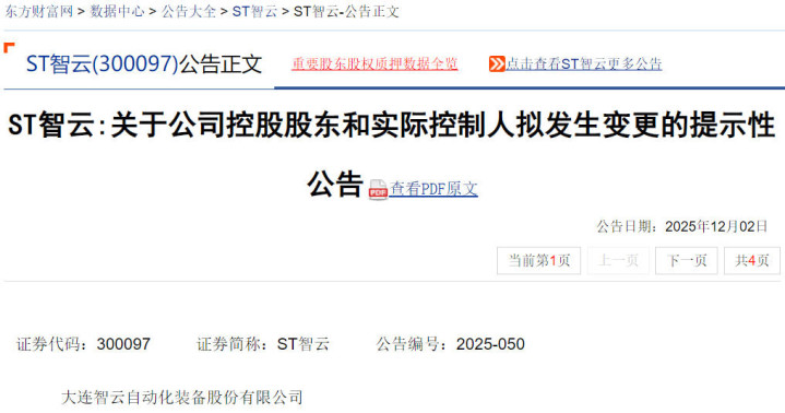 股票索赔平台微信公众号“公义之星”讯,2025年12月2日,ST智云(智云股份300097)公告披露:公司股东师某全拟将其持有的24,707,628股股份(占总股本的8.56%)的表决权委托给慧达富能;同日,慧达富能拟受让股东谭某良所持14,500,000股股份(占总股本的5.03%),及与拟受让股东宋某江14,500,000股股份(占总股本的5.03%)的姚某军签署一致行动协议。上述交易完成后,慧达富能将控制公司18.61%股份的表决权,成为公司控股股东,慧达富能实控人冯某及邓某将成为公司的实控人。